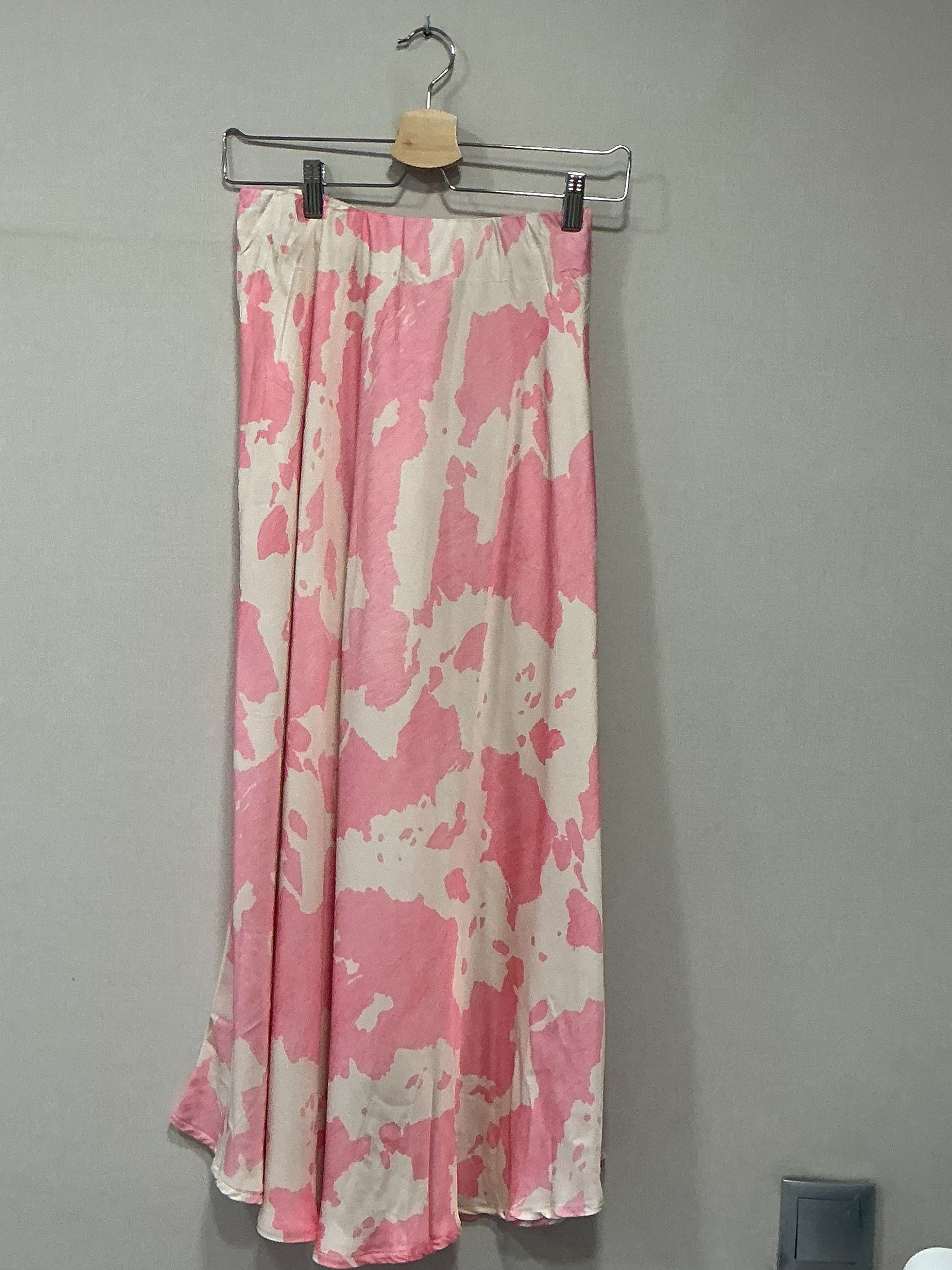 Falda de raso estampado de vaca en beige i rosa, talla única
