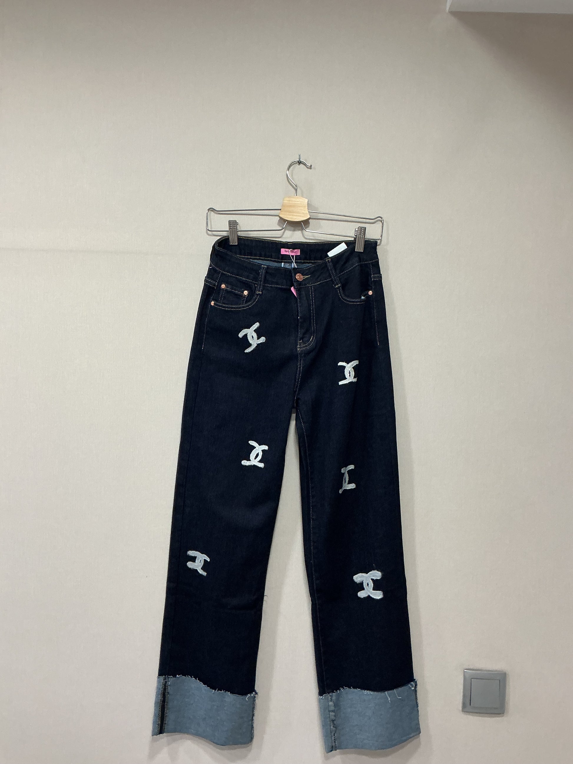 Pantalón denim logos, Pintado a mano talla L , tiene licra