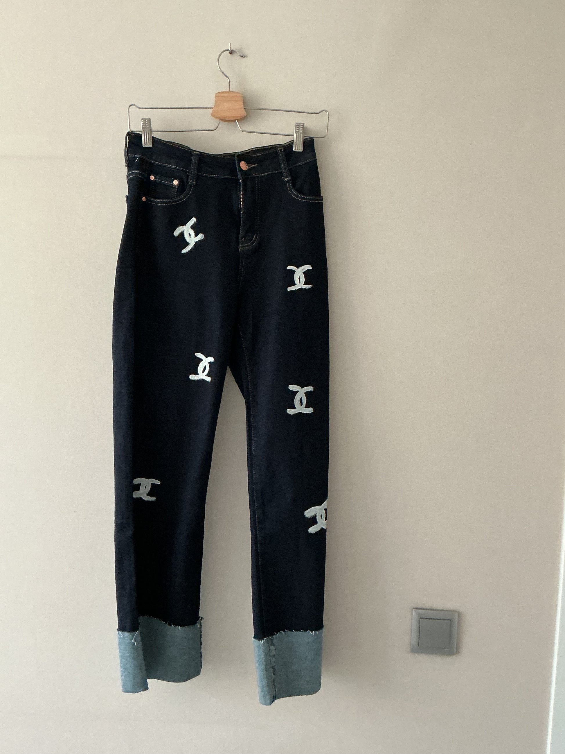 Pantalón 5 bolsillos denim, pintado a mano dobladillo en los bajos, contiene elastina