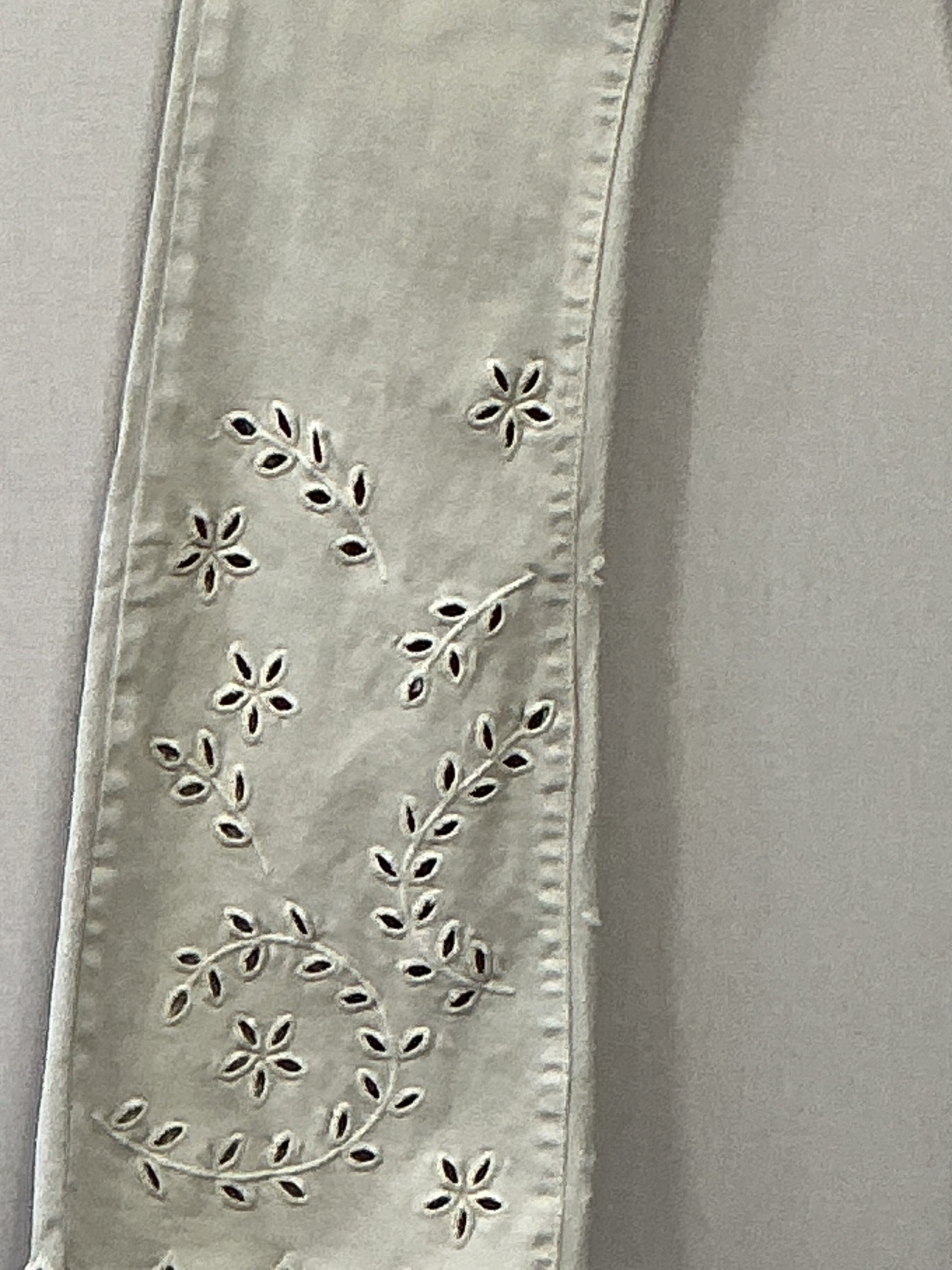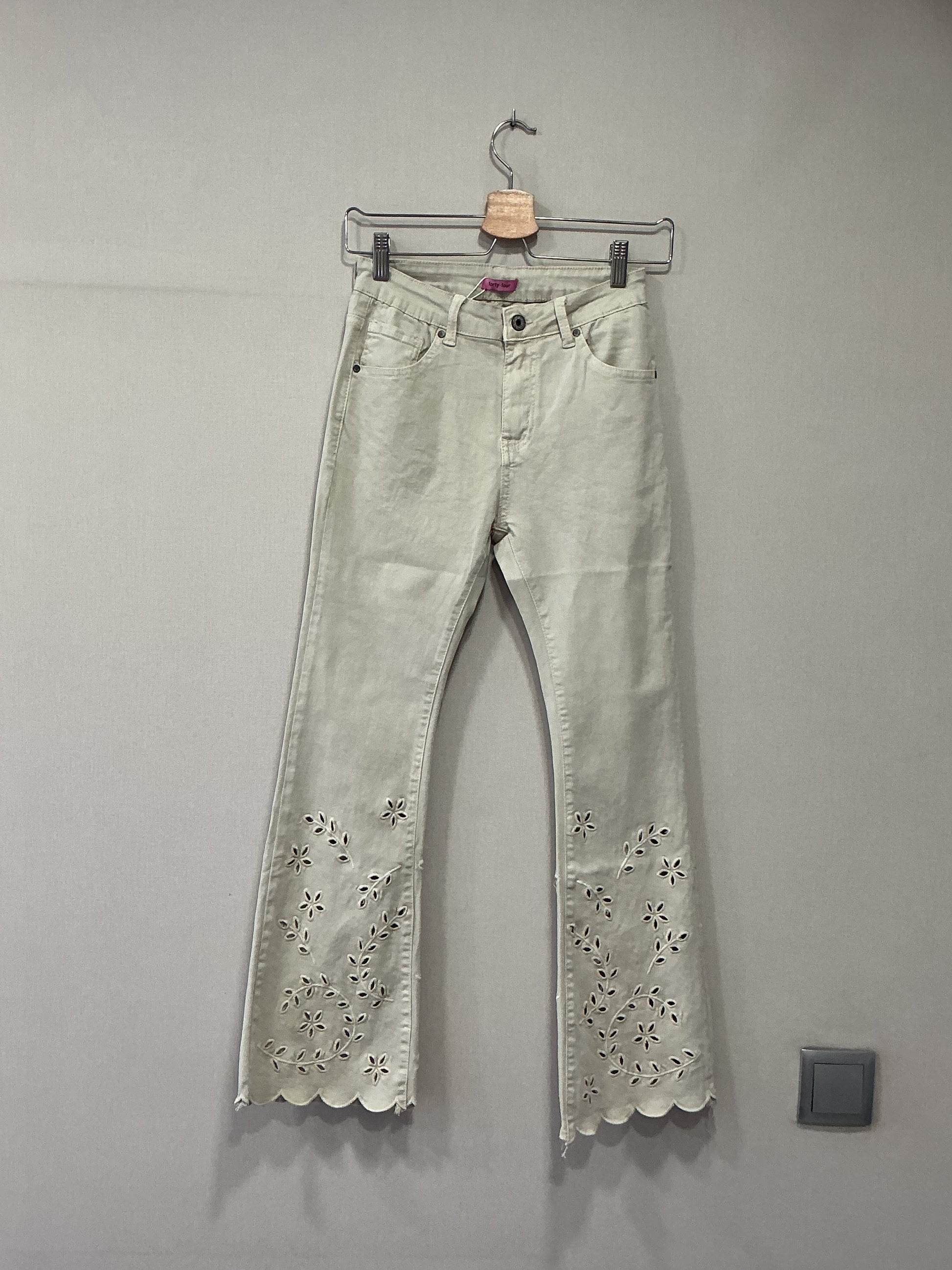 Pantalón beige troquelado cinco bolsillos, cómodo porque contiene elastan