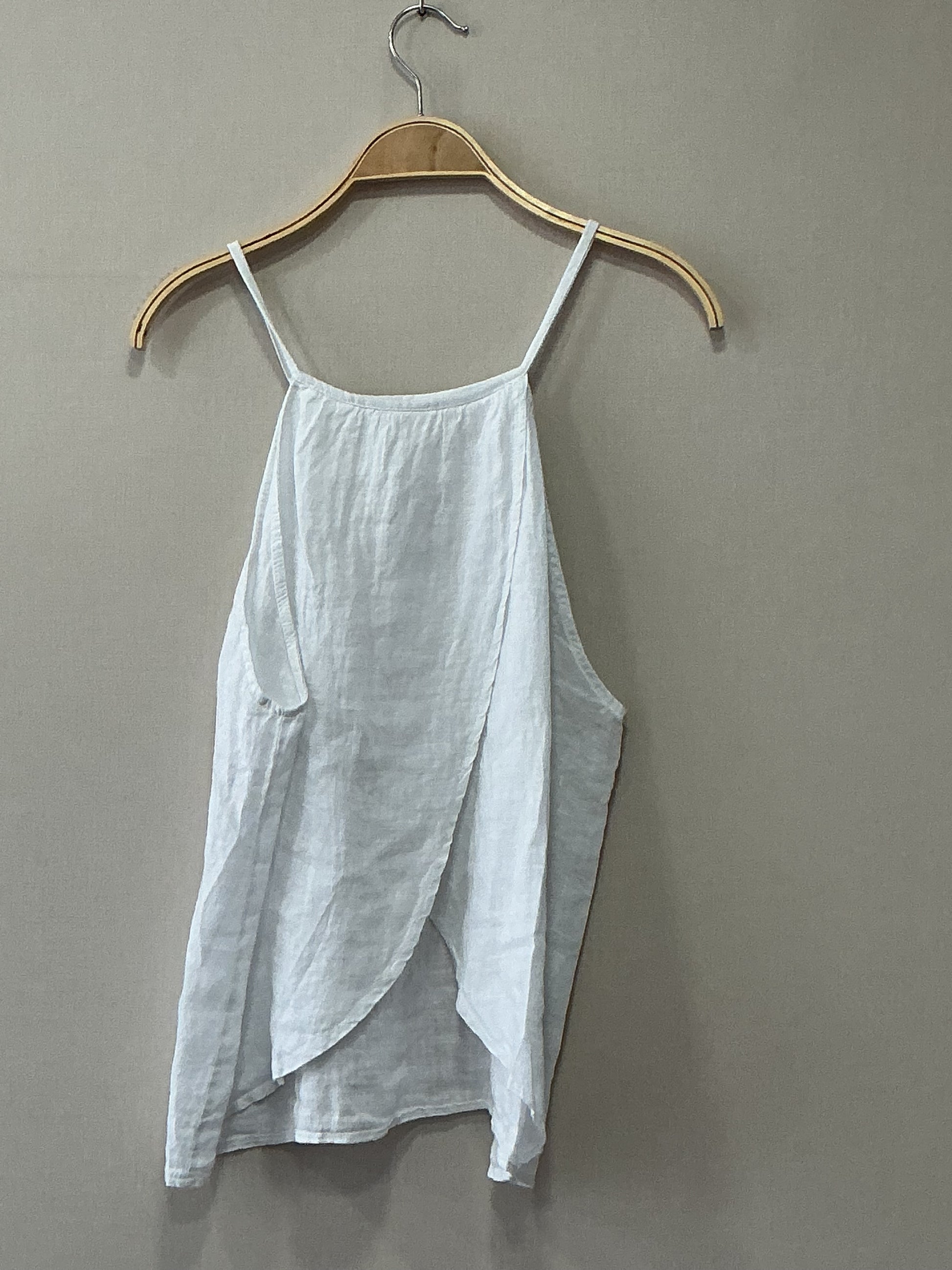 Top Blanco de Hilo , tirante spaguetti , abierto del lateral debajo de la axila , y queda un poco abierto por debajo de pecho, que puede mostrarse un poco la Barriga