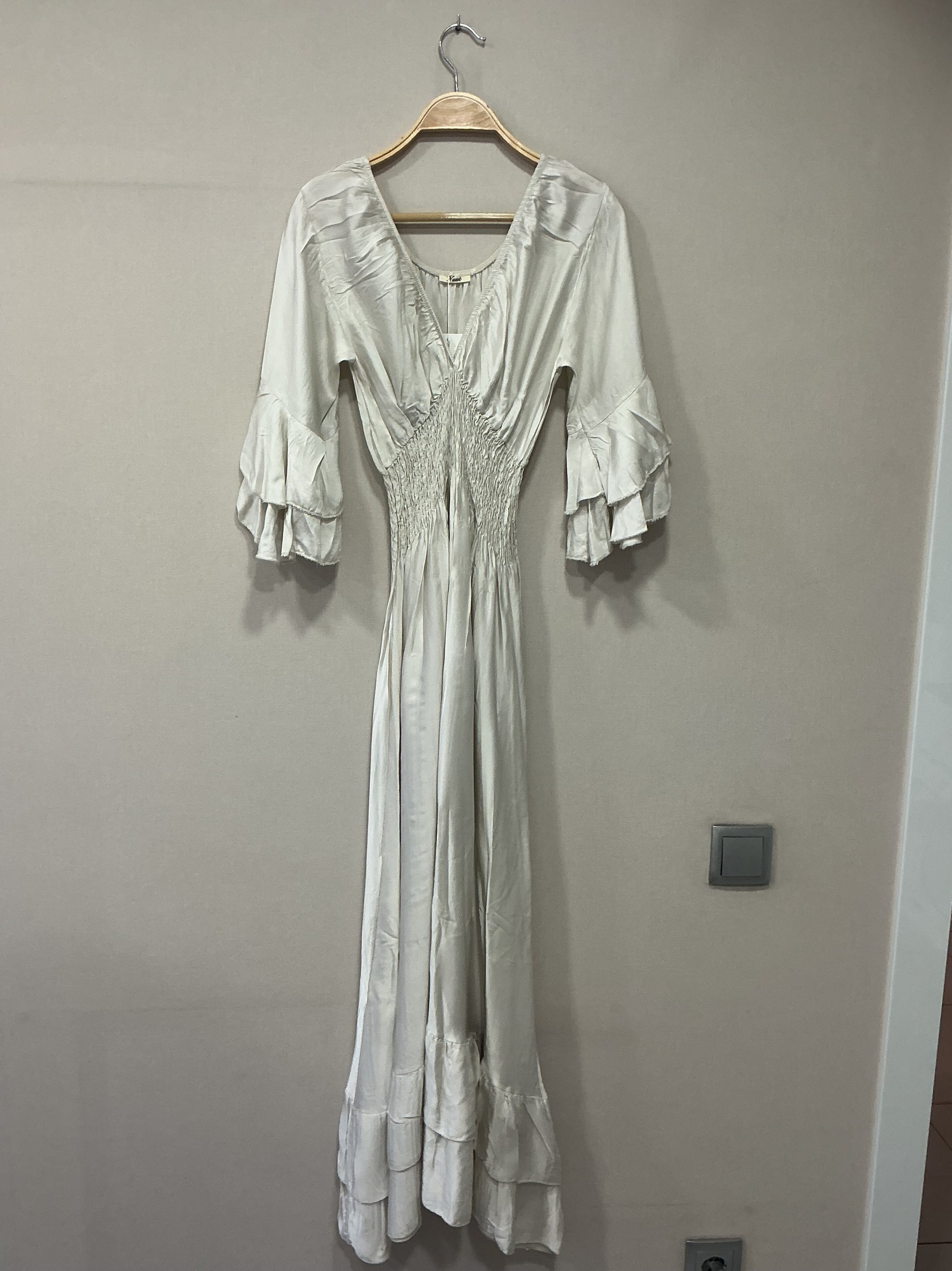 Vestido perlado largo de raso, fruncido en cintura, con manga de volantitos, talla única tallaje pequeño, para tallas de la 34 a la 40